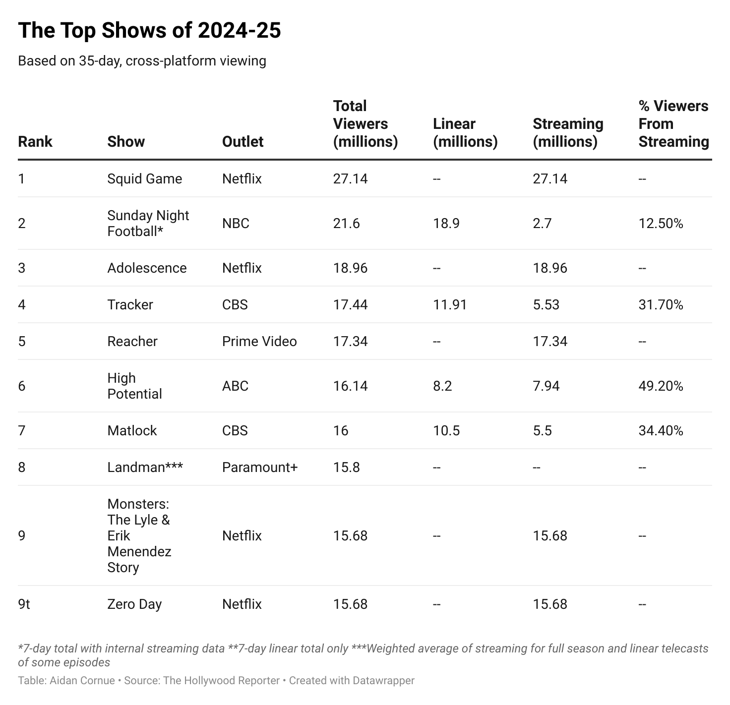 “The Hollywood Reporter” ran the numbers for the 2024-25 season, reporting that “the networks have never had as poor a showing at the Emmy nominations as they did this year.” The nomination scorecard: