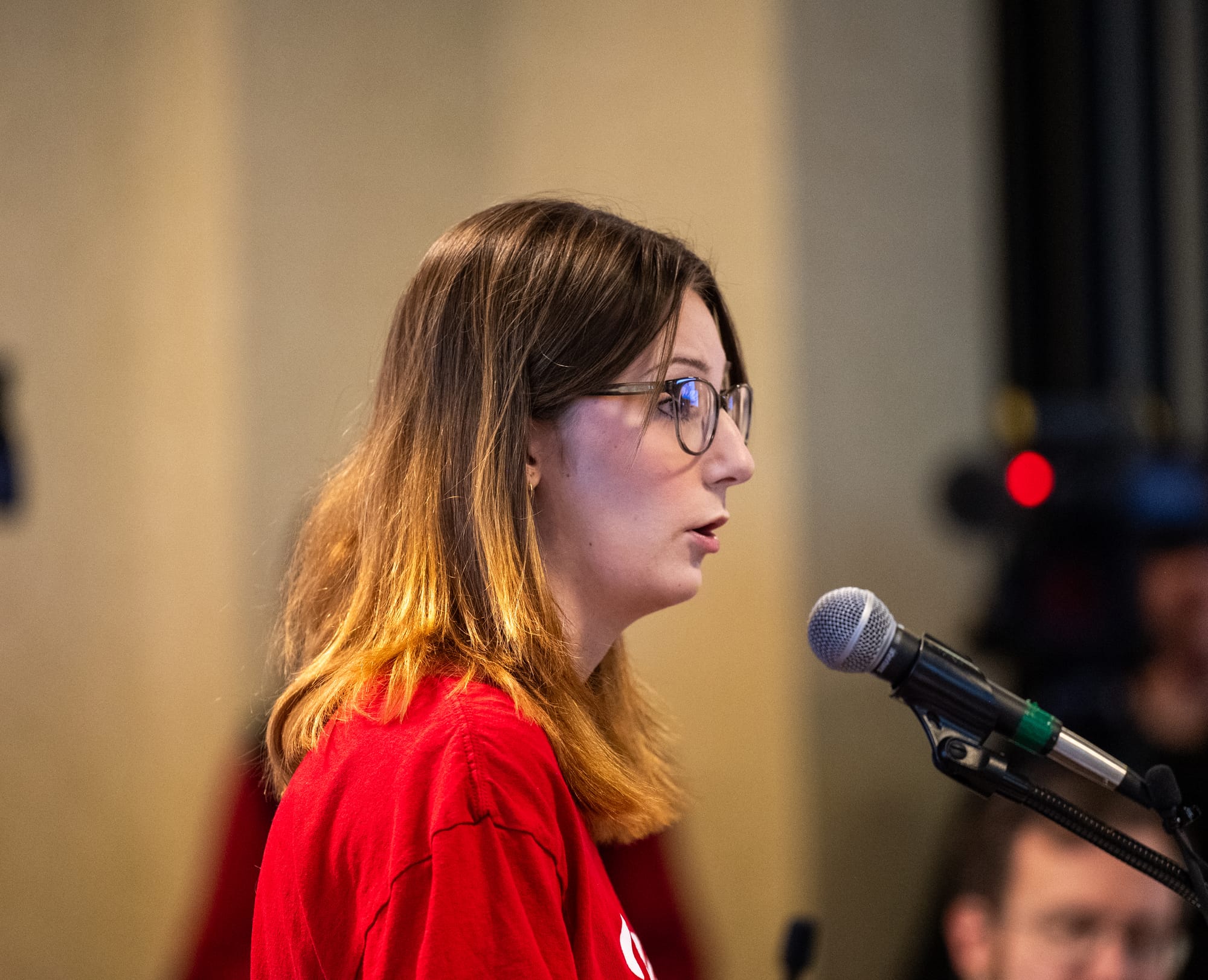 Senior Ashley Reynolds, 21, is the vice president of the Ohio Student Association, from which several Miami chapter members showed up to the meeting in protest of the arena.
