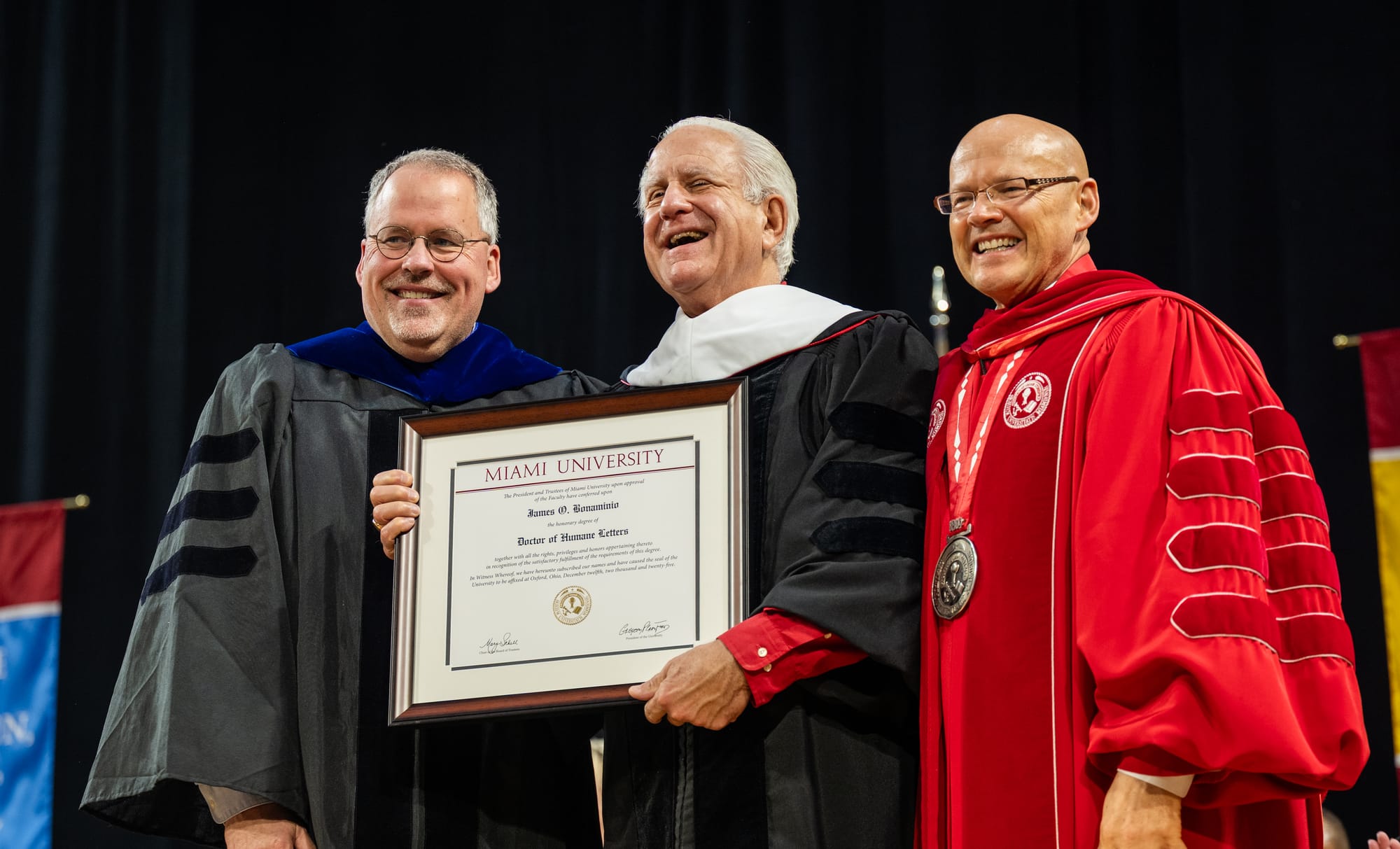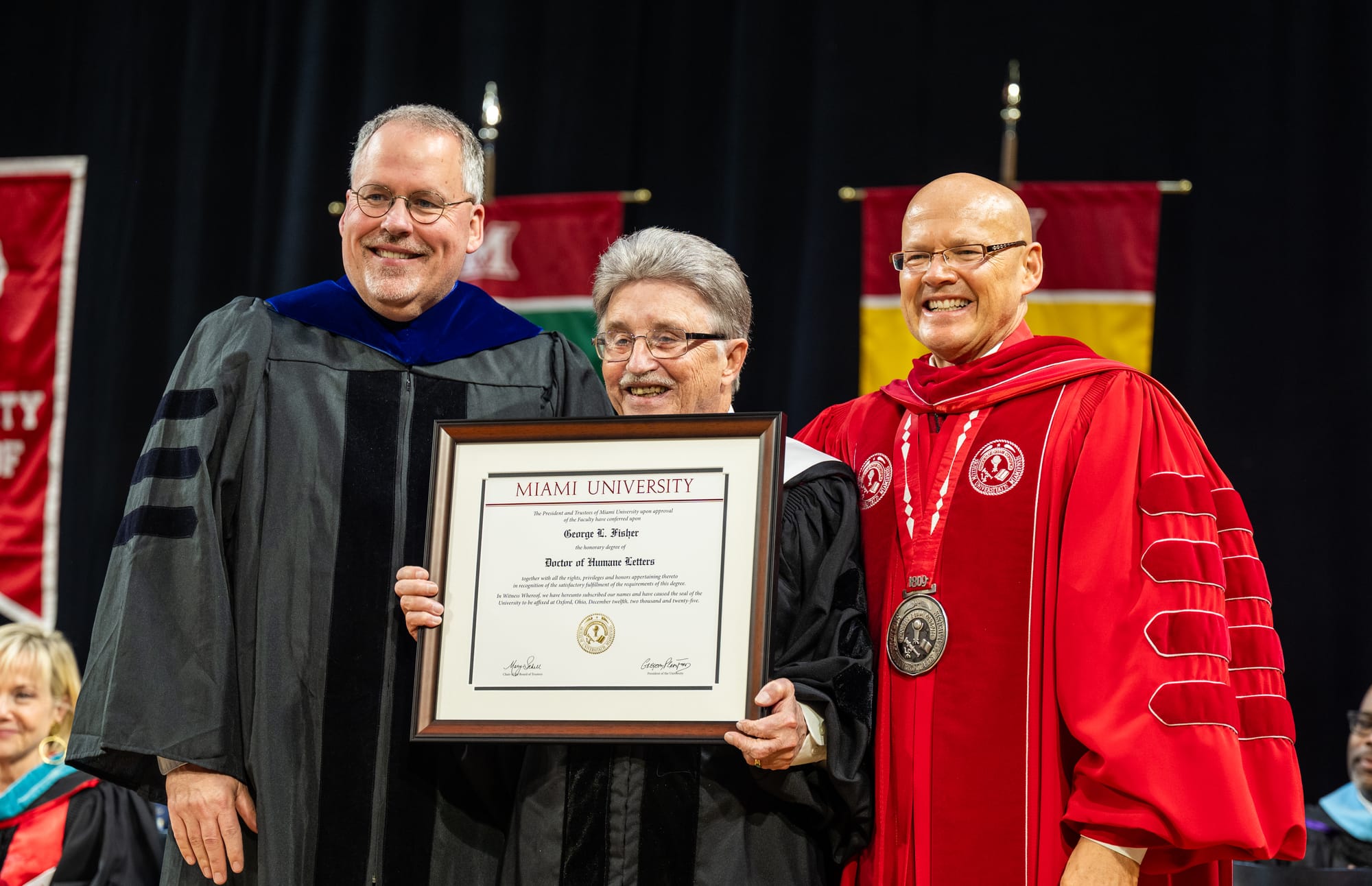 Lee and Rosemary Fisher, Miami University graduates and longtime contributors to the Oxford community, and James Bonaminio, founder of Jungle Jim’s International Market, received honorary degrees during the ceremony.