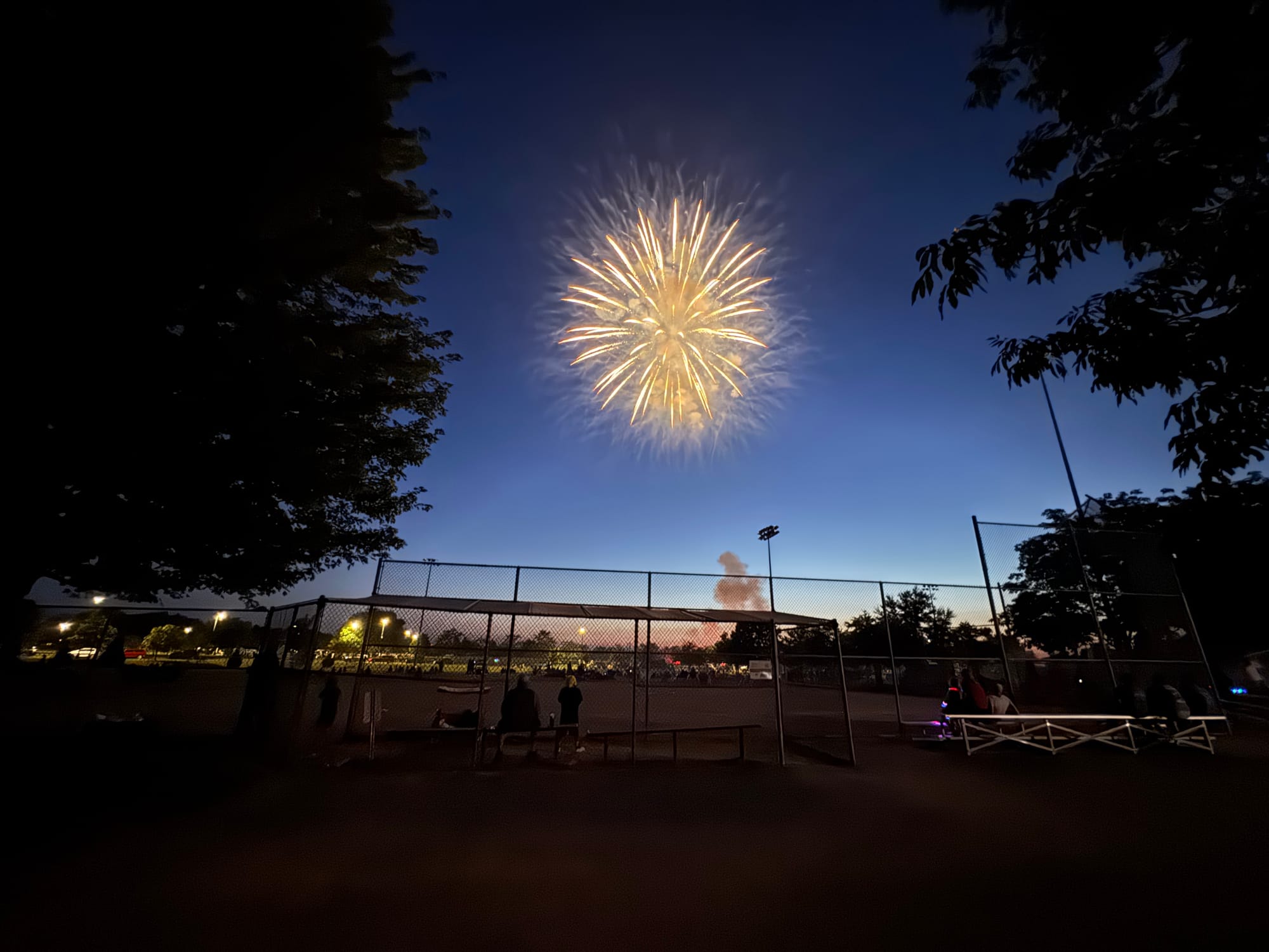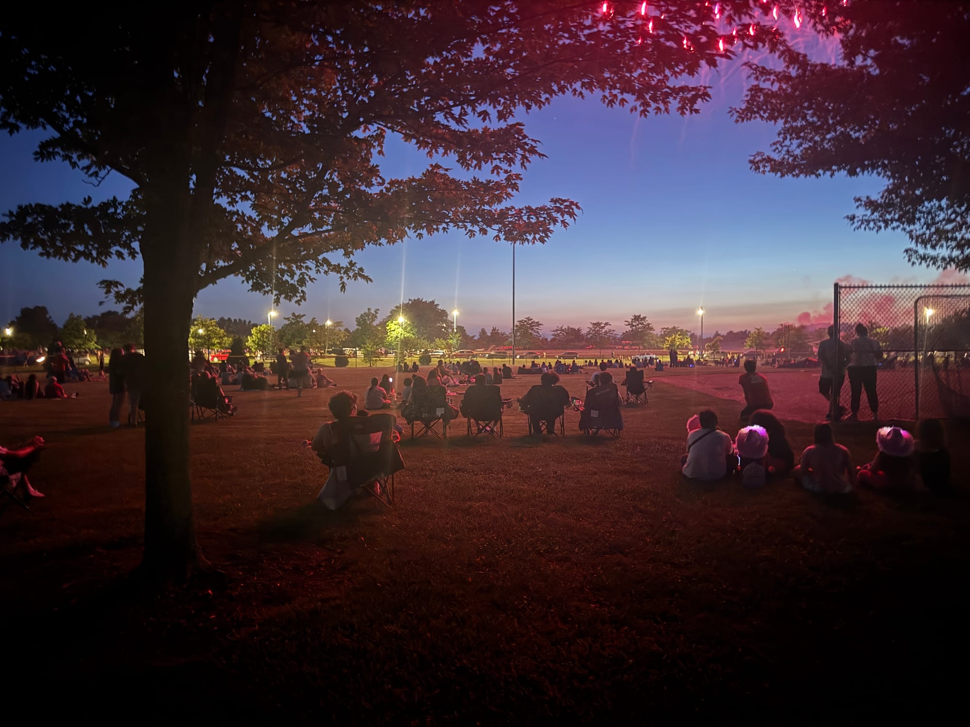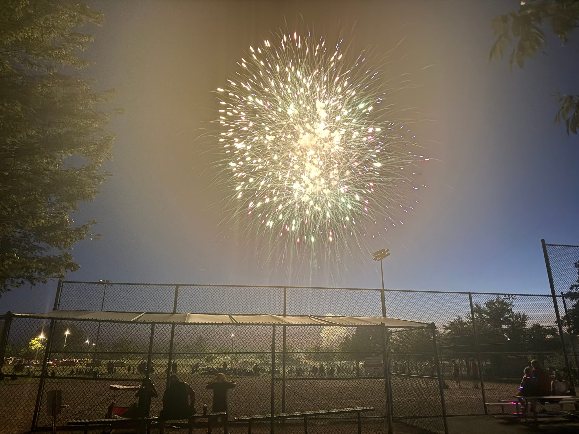 The first firework sparked at 10 p.m. on the dot. Viewers watched the half-hour display from the baseball pitch, the sidewalks and park benches.