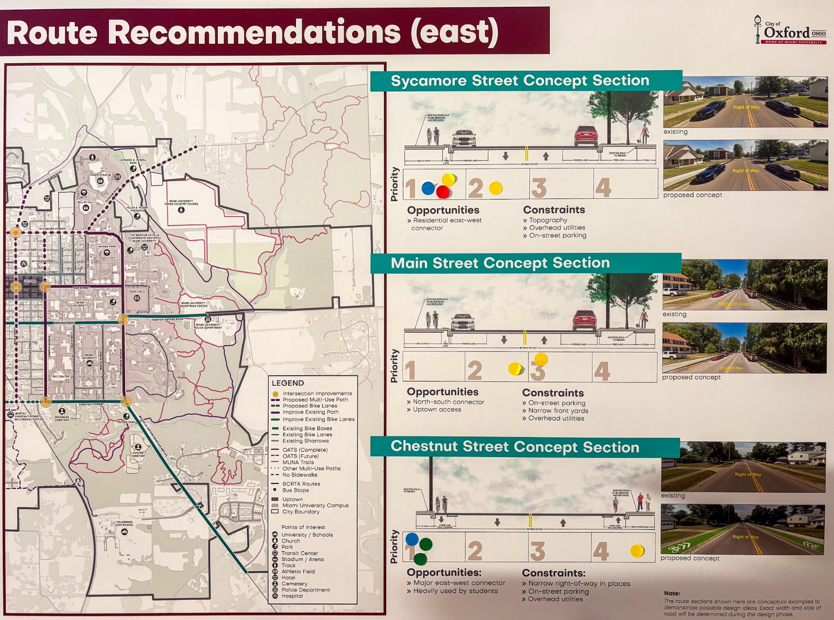 For the east side of Oxford, which consisted of route recommendations for Sycamore, Main and Chestnut streets, the Main Street recommendation was ranked as the lowest priority of the three. Recommendations for Sycamore and Chestnut streets were equally marked by the attendees as being of top priority.